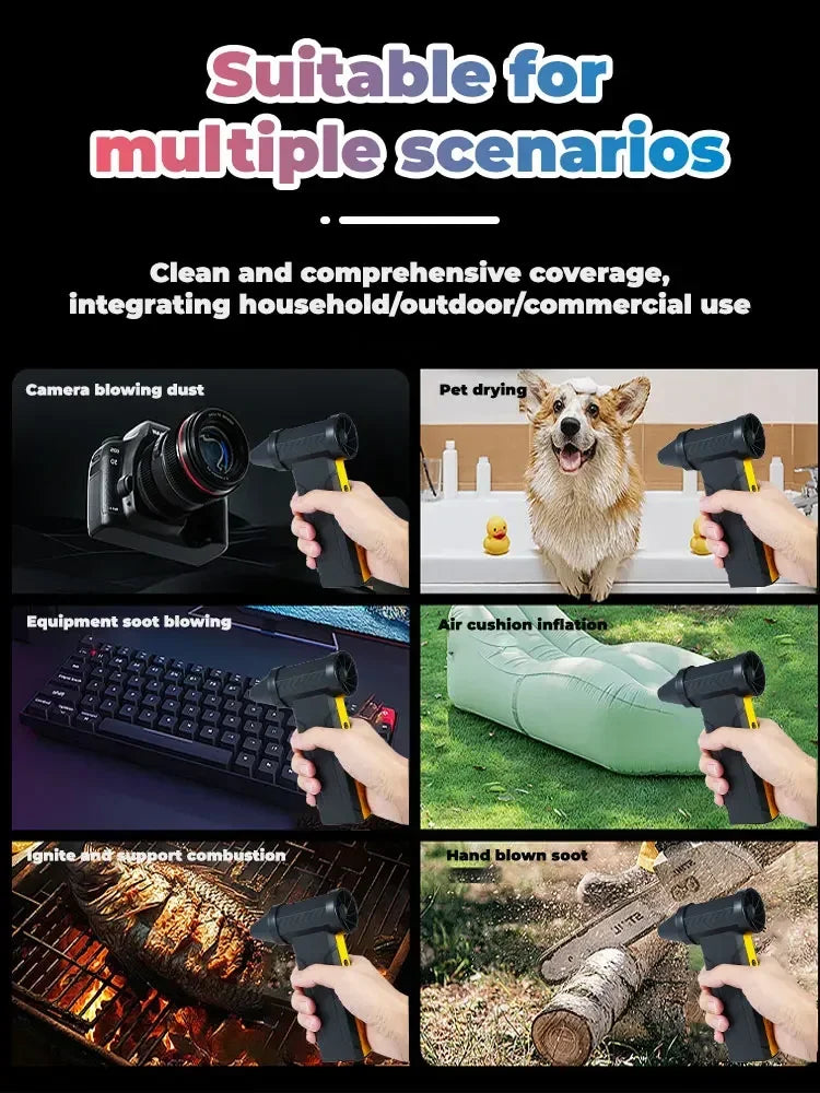 4. Usage: Air cushion blowing and suction, computer equipment cleaning, industrial dust blowing, charcoal burning to support combustion, car blowing and snow blowing, film studio shooting and wind making, drying pets, and many other uses.